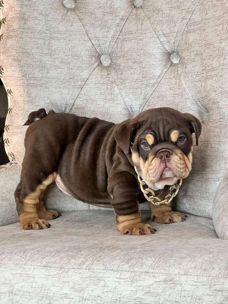 Stunning English Bulldog with deep chocolate coat and tan markings. Incredibly wrinkled with premium structure. Gold cuban chain included — this pup was born for the spotlight.